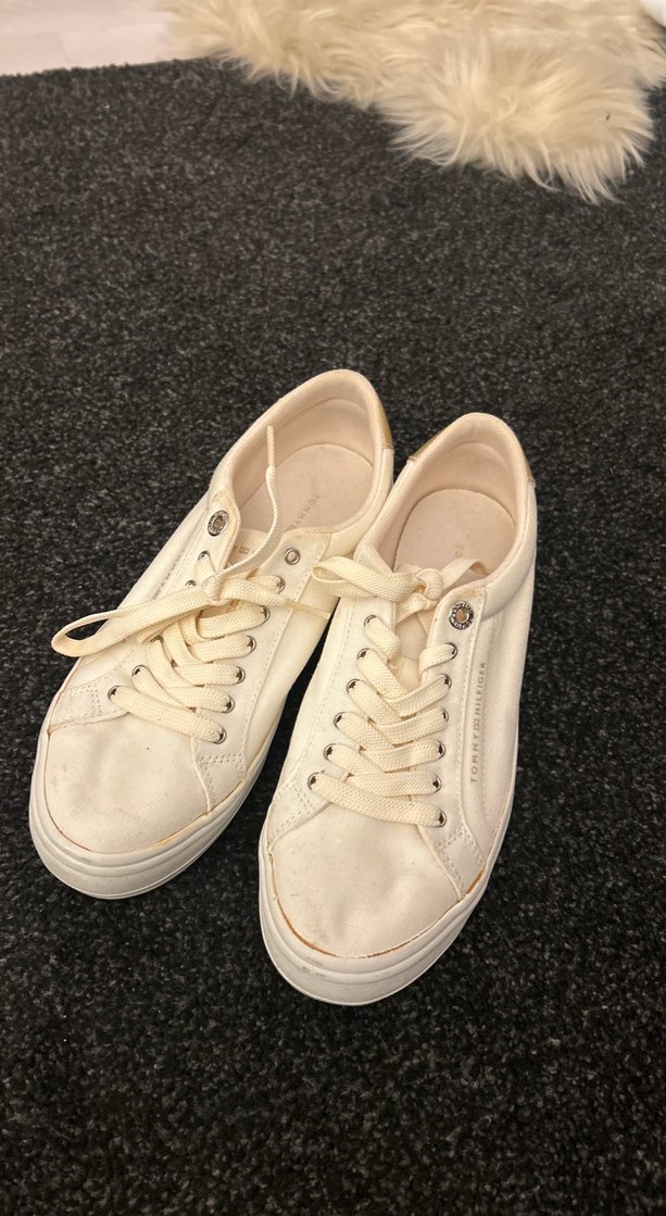 Beyaz, lastik tabanlı minimalist kadın spor ayakkabısı. İnce topuklu ve şık, günlük sokak stili için uygundur. Tommy marka orjinal