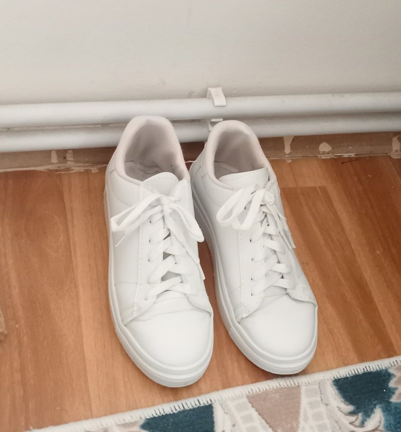 Düz beyaz renkli, kadın spor ayakkabısı. Kauçuk malzemeden, desen içermeyen sade tasarım, günlük sokak stili için uygun.az giyilmiştir.Ayakkabı yıkanmıştır