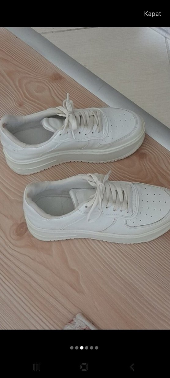 Beyaz, platform tabanlı, lastik malzemeden minimalist kadın spor ayakkabısı. Desensiz, gündelik sokak stiline uygun, zahmetsiz şıklık sunar. Sadecee düğünümde çekim yaparken giydim hiç bi şeyi yok yüksek taban olduğu için giyemiyorum temizliği yapılıp gönderilecektir
