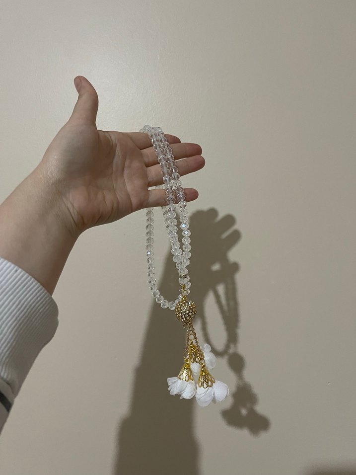 Şeffaf yuvarlak boncuklardan oluşan beyaz minimalist erkek tesbihi, bohem tarzda dekoratif püsküllerle tamamlanmıştır. Hafif ve zarif tasarım. ️