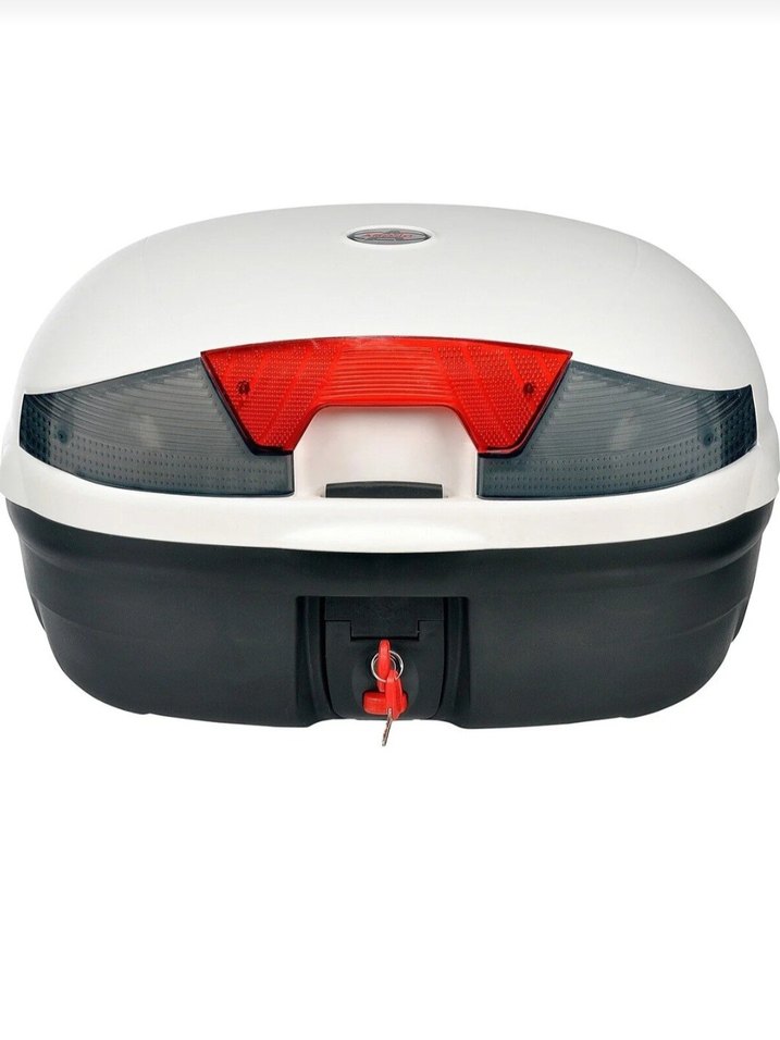 Bu beyaz minimalist motosiklet bagajı, tokalı tasarımı ve plastikten yapılmış düz yüzeyiyle temel koruma sağlar. Hafif renkte ve güvenli bağlama özelliğine sahiptir. 46 lt