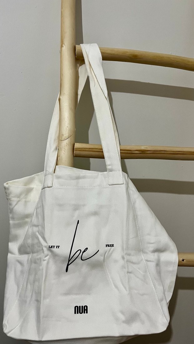 Beyaz pamuklu çanta, "let it be free" yazılı baskıya sahip. Minimalist ve rahat şıklık sunar, günlük sokak stiline uygun.