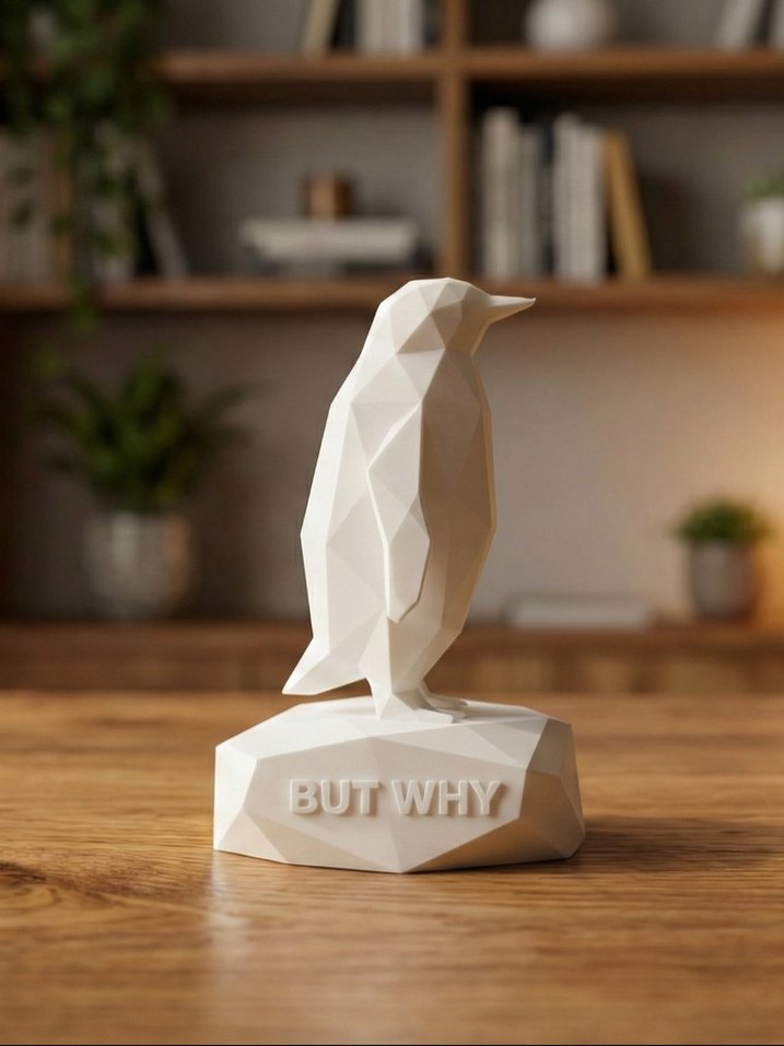 Geometrik yüzeylere sahip beyaz minimalist penguen figürü, tabanında "BUT WHY" yazısı bulunur. Modern bir dokunuş sağlar. boyu 10 cm