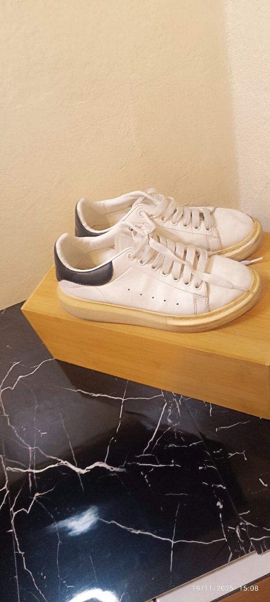 Platform topuklu beyaz minimalist kadın spor ayakkabısı, topuk kısmında siyah detaylıdır. Kauçuk malzemeden üretilmiş, desen içermeyen, rahat ve şık bir modeldir.
