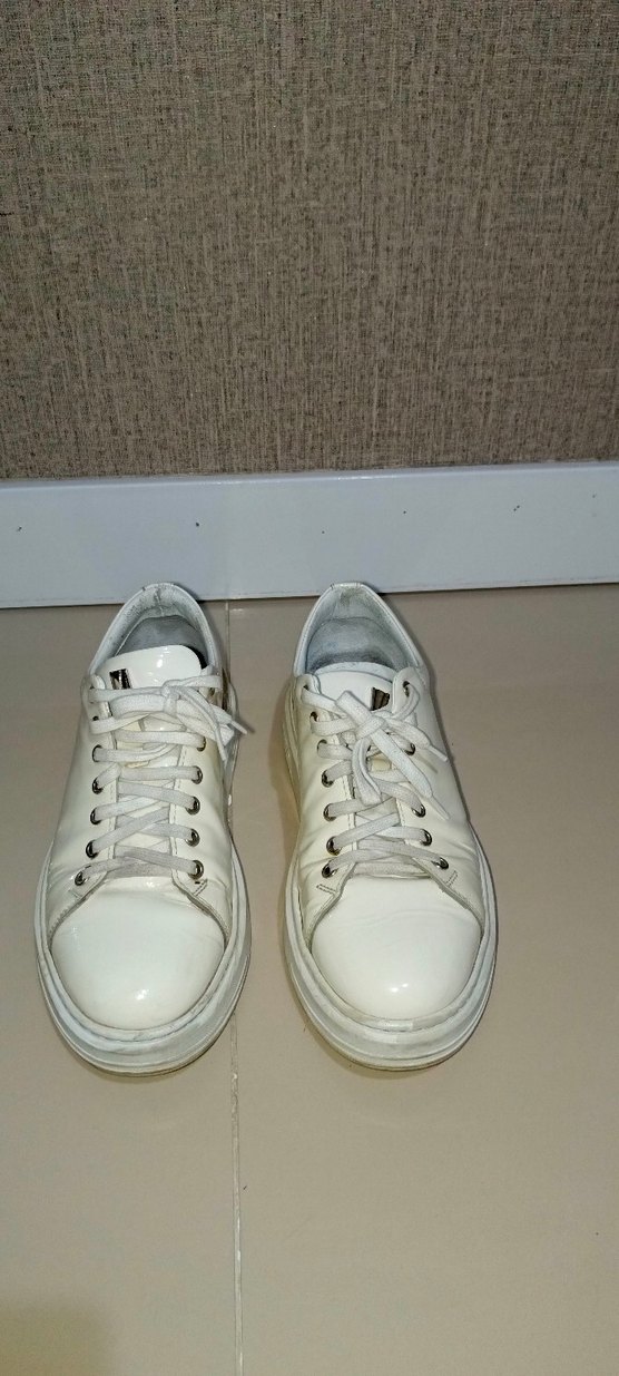 Parlak beyaz yüzeye ve düz kauçuk tabana sahip minimal tasarımlı erkek spor ayakkabısı, günlük sokak giyimine uygun şık bir seçenek.