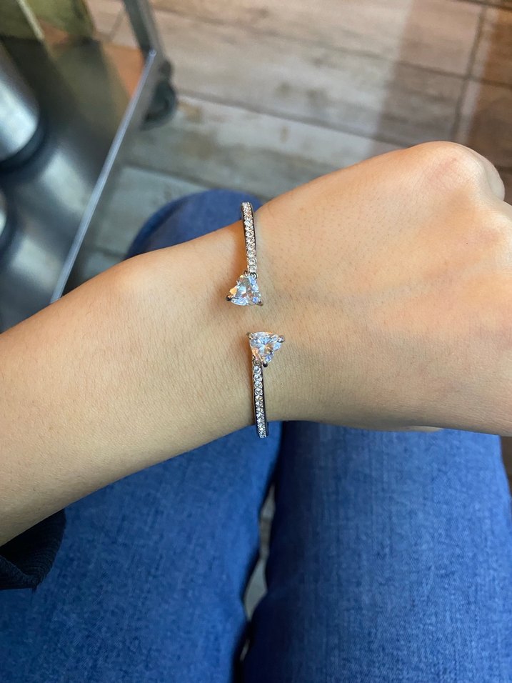 Beyaz renkte, minimal ve sıra taşlı detaylara sahip, çağdaş açık uçlu bileklik. Düğünler için uygundur.