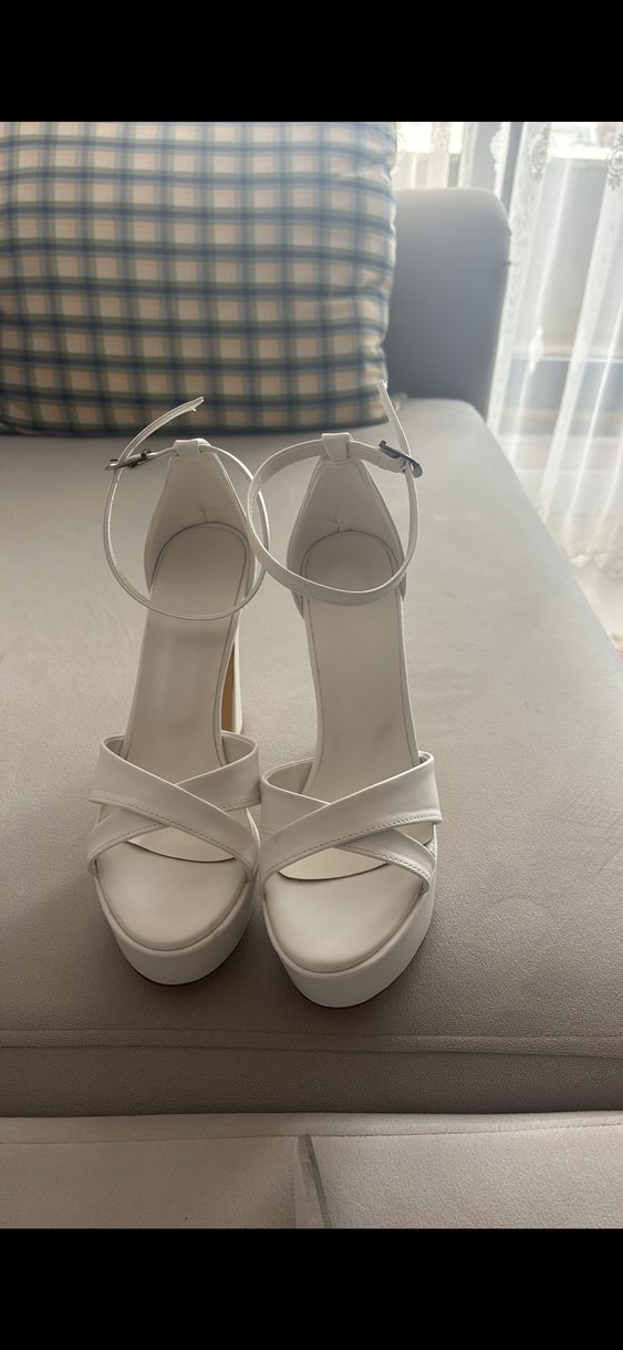 Beyaz, tokalı bantlı, kauçuk malzemeden yapılmış minimal stiletto topuklu ayakkabılar. Düğün ve çağdaş tarzlar için uygundur. Düğünümde kullanmıştım artık kullanmayacağım satıyorum. Topuklunun bir tanesinde bilek kısmında ufak bir dikim oldu fakat belli bile değil. Fotoğrafını çekip koydum.