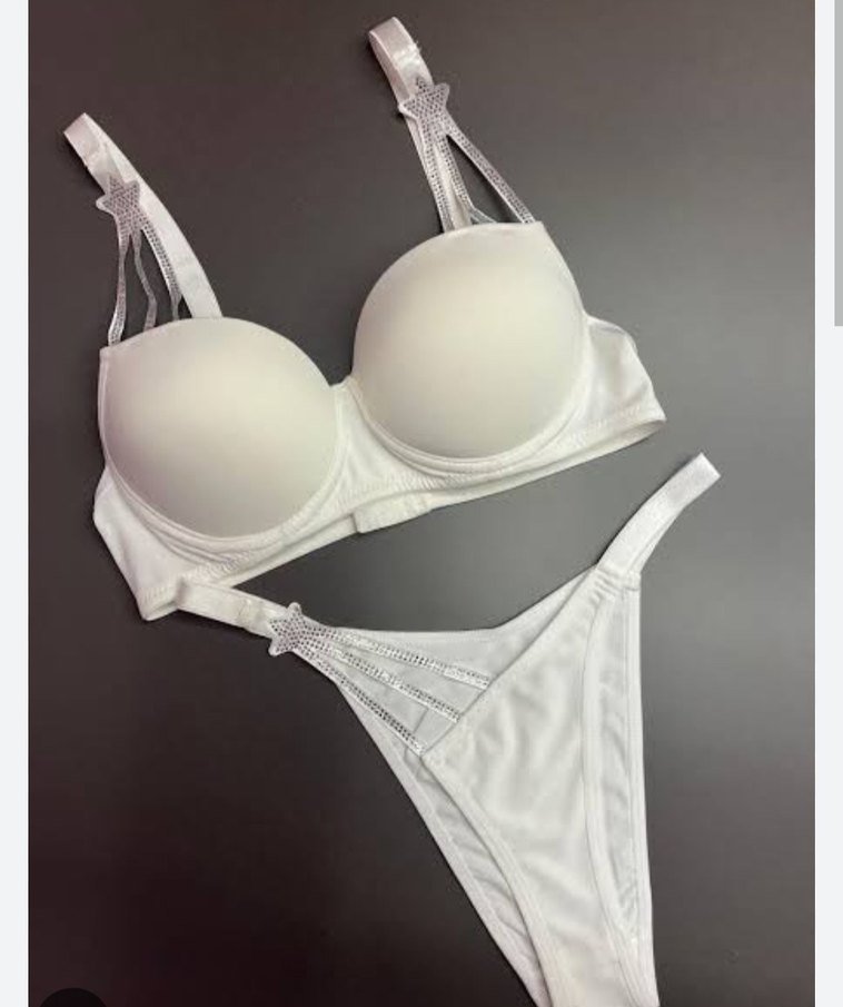 Beyaz minimalist sütyen ve külot takımı, desensiz ve pürüzsüz tasarıma sahip. Askılarda yıldız detayları bulunur, modern ve rahat stil sunar. ✨