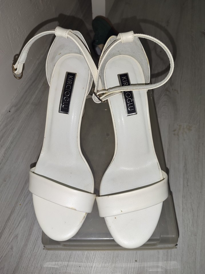 Beyaz, tokalı bilek kayışlı, kauçuk malzemeden yapılmış topuklu ayakkabı. Minimalist tasarım, düğün ve sokak tarzı için uygun. Pastel tonlarda ve desensiz. ürün sadece dış çekimde kullanıldı.