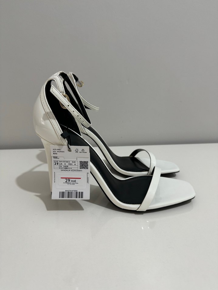 Beyaz, tokalı bantlı, lastik malzemeden yapılmış stiletto topuklu sandalet. Minimalist ve çağdaş tasarıma sahip, romantik akşamlar için uygun.