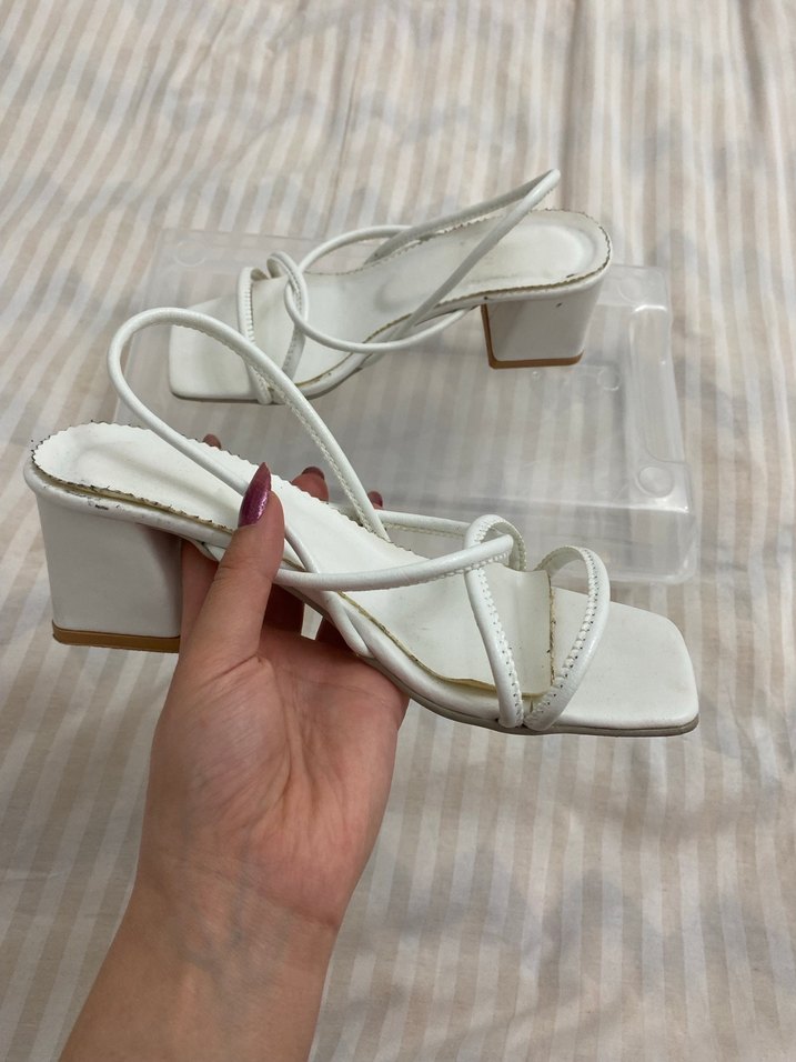 Beyaz renkli, blok topuklu ve ince kayışlı, tokalı kadın sandalet. Kauçuk malzemeden üretilmiş, günlük kullanım için uygun klasik ve minimalist tarzda.