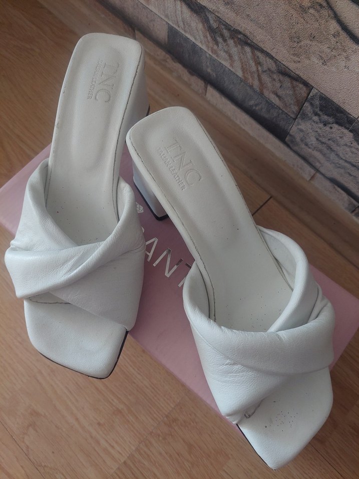 Beyaz blok topuklu kadın terlikler, minimalist tasarım ve kauçuk malzeme ile. Desensiz, zahmetsiz şıklık sunar, düğünler için uygundur.