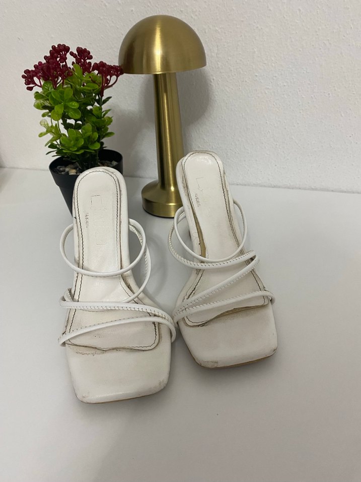 Beyaz, ince bantlı, minimalist tasarımlı, lastik malzemeden topuklu terlikler. Desensiz, şık ve klasik zarafetiyle düğünlere uygun.
