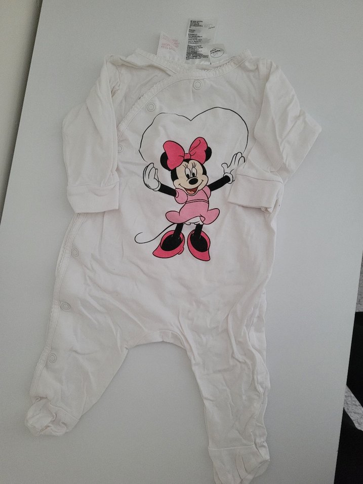 Beyaz renkte, renkli Minnie Mouse baskılı, düğmeli bebek tulumu. Uzun kollu ve tam bacaklıdır, rahat kullanım sağlar.