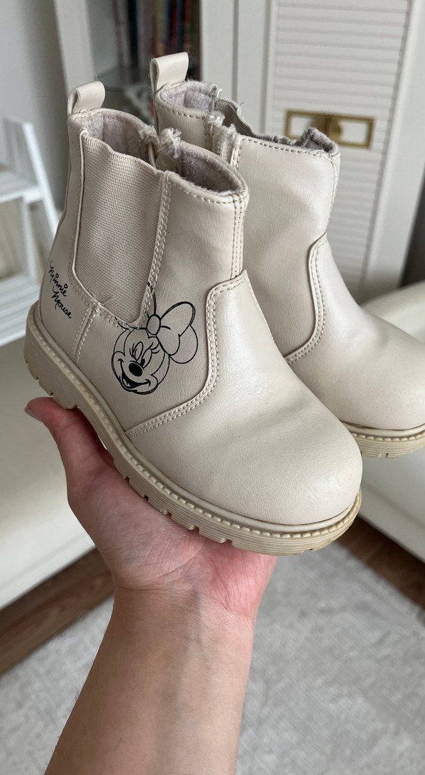 Beyaz kauçuk kız botu, Minnie baskılı ve tokalı detaylara sahip, trend sokak stili için uygundur.