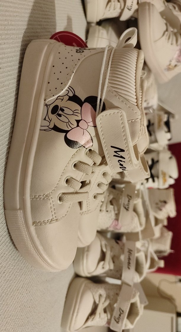Beyaz renkte Minnie baskılı kız spor ayakkabısı, kauçuk tabanlı ve kolay kullanım için cırt cırtlı bantlıdır. Hafif ve trend sokak stili.