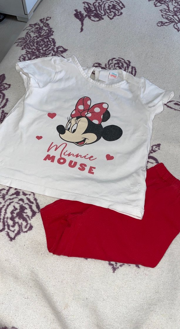 Beyaz kısa kollu üstte Minnie Mouse renkli baskı ve kırmızı pantolon bulunan bebek kız takımı.