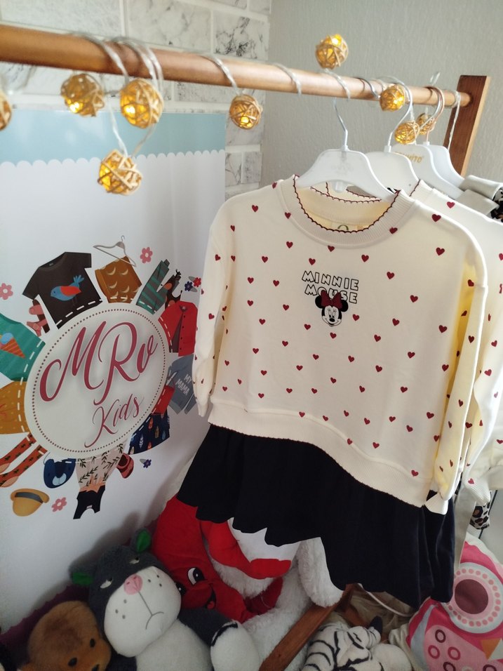 Pamuklu, beyaz renkli, uzun kollu rahat kalıp elbisemiz 4-5/5-6/7-8 yaş mevcutMinnie Mouse baskısı, renkli kalpler ve fırfır detayıyla sokak modası tarzında.