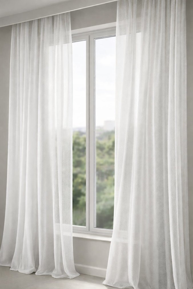 Modern tarzda, desensiz beyaz tül perdeler, yumuşak ışık geçirir. Çağdaş mekanlar için uygundur. En 400*260 sık kanun pile istege göre boy ölçüsü ayarlanır