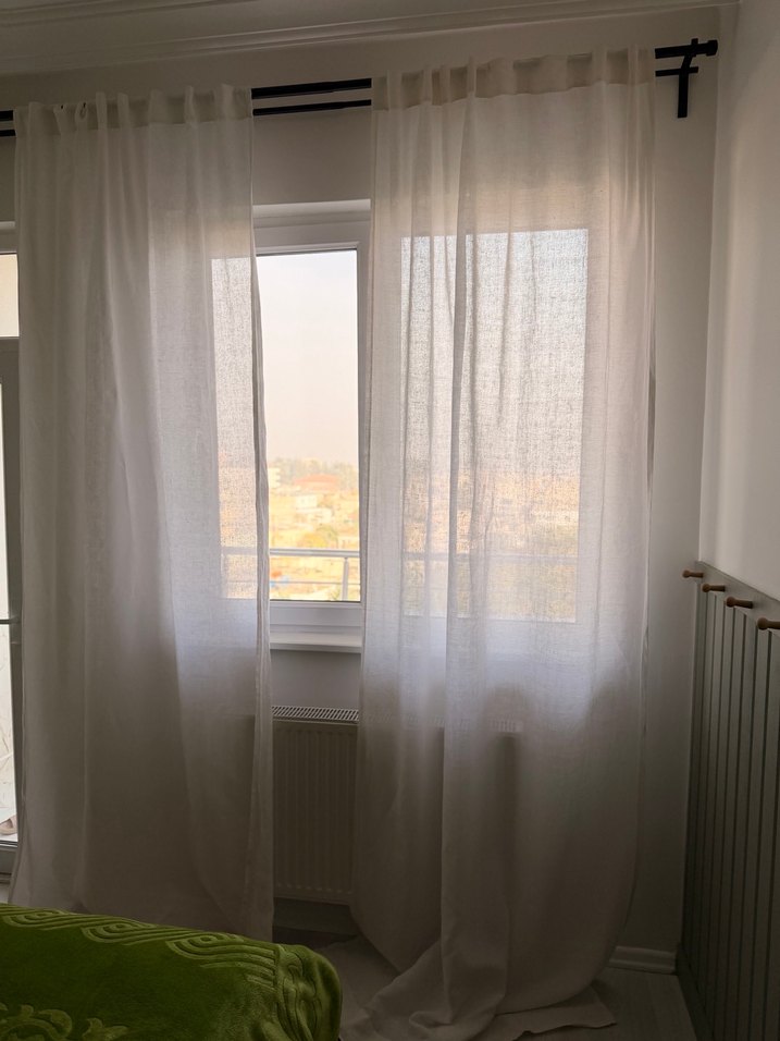 Beyaz modern ve desensiz perdeler, hafif kumaştan yapılmış olup yumuşak doğal ışığın geçmesine izin verir. Temiz bir görünüm için sade tasarıma sahiptir.