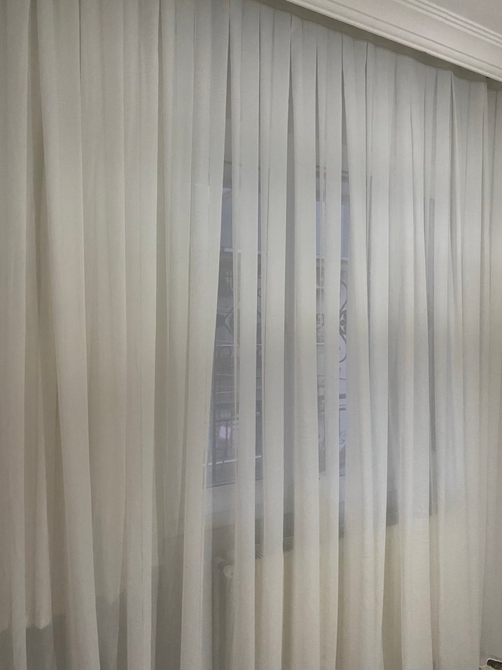 Beyaz, modern tarzda, desen içermeyen düz tül perde, ışığı yumuşakça süzerek ortamı aydınlatır.