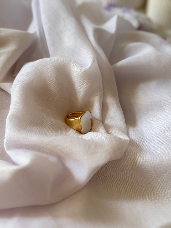 Altın kaplama üzerinde beyaz, desensiz yüzük. Modern klasik tarzda, Paris esintili, düğünler için uygun, zarif bir tasarım. Çelik üründür. Kararma yapmaz.