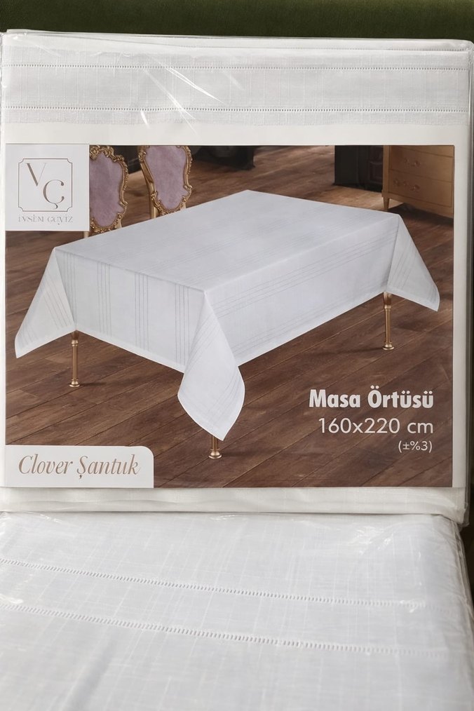 Beyaz, parlak desenli modern klasik masa örtüsü, 160x220 cm ölçüsünde. Sofralara şıklık katar. ️
