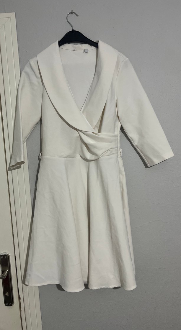 Beyaz renkte, modern klasik tarzda, beli oturan ve midi boyda uzun kollu elbise. Sarma detaylı sade ve şık bir tasarım sunar.