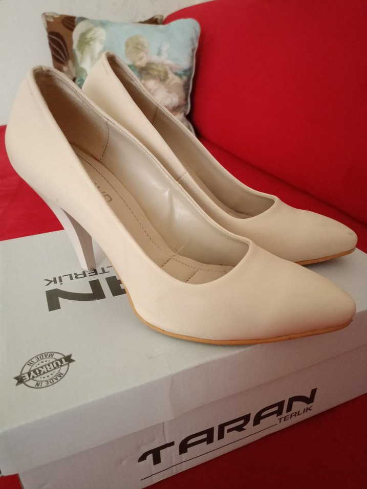 Beyaz renkte, modern klasik tasarıma sahip stiletto topuklu ayakkabılar. Kauçuk malzemeden üretilmiş olup ofis kullanımı için şık ve zahmetsiz bir stil sunar.