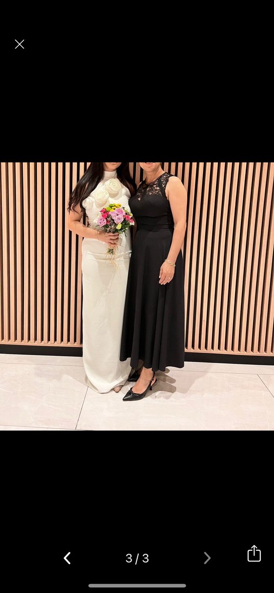 Beyaz, straplez yaka ve ince askılı, uzun A-kesim gelinlik. Modern klasik tarzda, Paris şıklığını yansıtan şık ve zarif bir model.