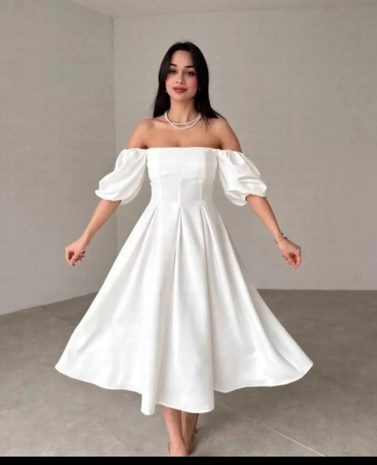 Beyaz, tek renk, modern klasik uzun elbise. Kayık yaka, bol kesim, dökümlü ve askılı kolludur. İpek gibi kumaştan, düğün için uygundur.