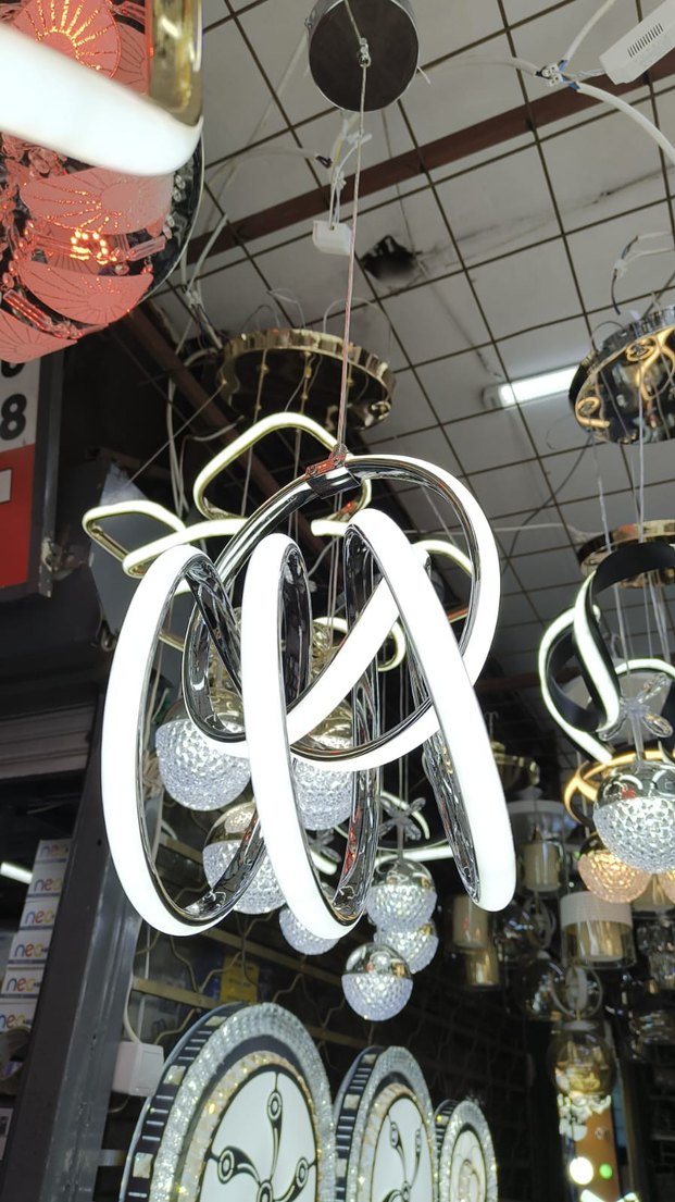 Beyaz modern LED avize, krom çerçeve ve iç içe geçmiş ışık şeritleri ile şık ve parlak aydınlatma sağlar.