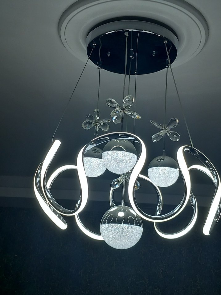 Beyaz modern LED avize, kıvrımlı ışık şeritleri ve dekoratif cam kürelerle şık ve parlak bir atmosfer sunar.