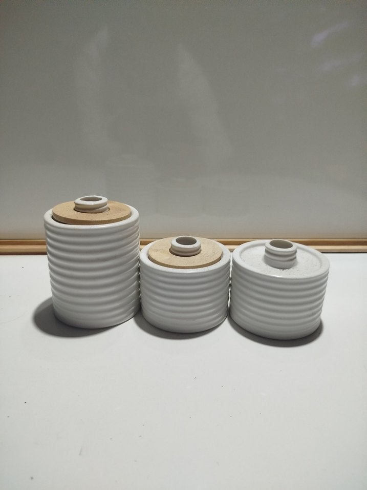 Üç boyutlu beyaz seramik saklama kavanozları, modern çizgili tasarım ve ahşap kapaklı. Farklı boyut seçenekleriyle kullanışlı.