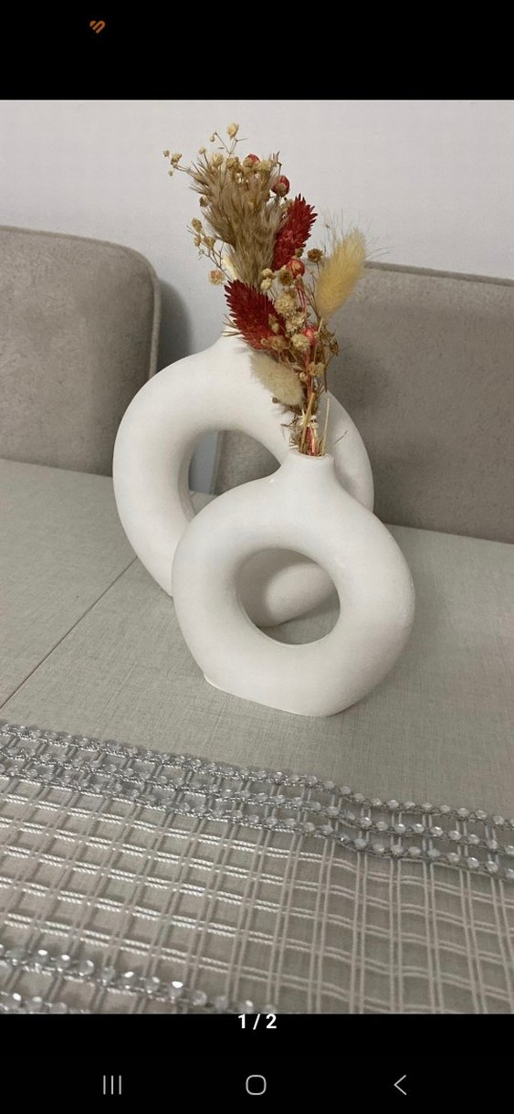 Mat beyaz renkte, dairesel boşluklu iki seramik vazo seti. Kuru çiçekler için uygundur.