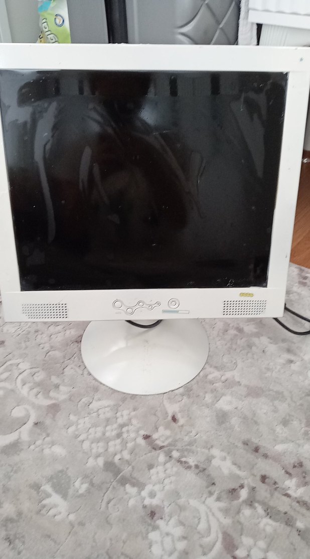 Yuvarlak tabanlı, ön kontrol düğmeli beyaz monitör. Kare ekran ve ön panelde dahili hoparlörler bulunur. beyaza boyamıştık monitör çalışıyor o konuda bir sıkıntısı yok ama eski bir model ve ekranda bir çizik var parça icin fln almak isterseniz hemen kargolarim