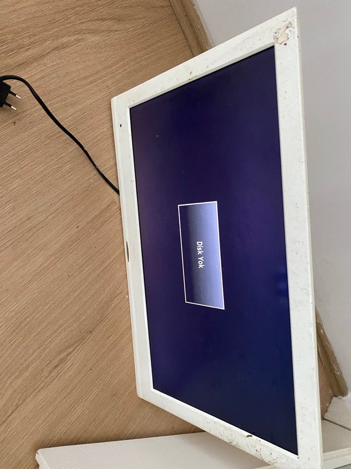 Ekranda 'Disk Yok' mesajı görünen beyaz monitör. Basit tasarıma sahip ve ahşap zemin üzerinde duruyor. ️