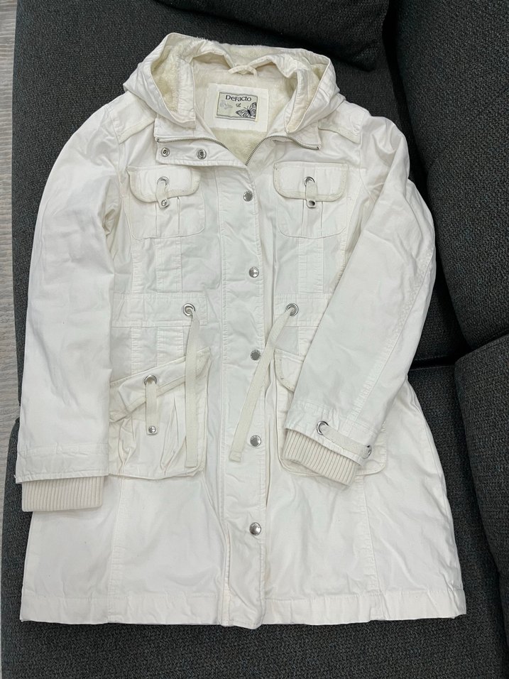 Kapşonlu Beyaz mont, boyu uzun . Bedeni L . Uzunluk ölçüleri resimde vardır. Sağ üst omuzda küçük leke vardır fotoğrafta gösterildiği gibi. Temiz kullanıldı.
