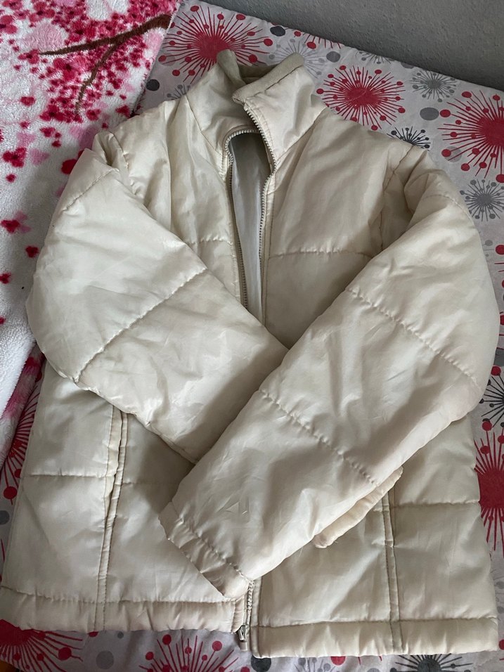 Fermuarlı, uzun kollu ve kesimli beyaz mont. Parlak yüzeyi ve rahat dokusuyla günlük kullanıma uygun, sade bir tasarım sunar.