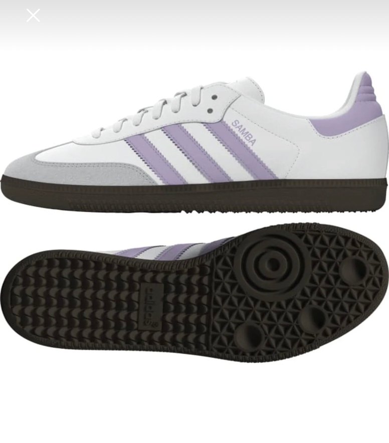 Adidas Samba sneakers, beyaz ve mor yumuşak üst yüzey, kauçuk taban ve bağcıklı kapanış ile sokak stili ve spor için uygundur. Sadece bir kere giyildi orijinal kutusuyla birlikte gönderilecektir.
