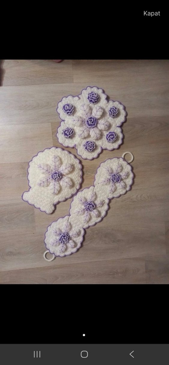 El örgüsü beyaz parçalar, mor çiçek süslemeleri ve asma halkaları ile birlikte, zarif desenlere sahiptir.