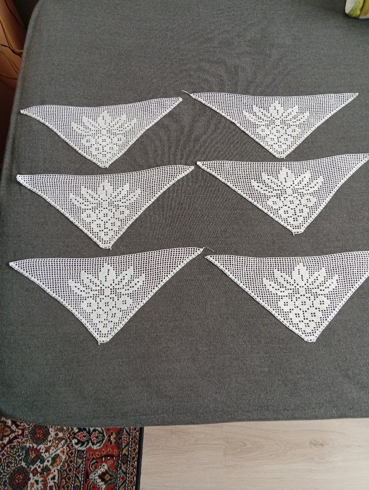 Altı parçadan oluşan beyaz, el örgüsü üçgen motifler, çiçek desenli ve geleneksel tarzda yapılmıştır. Dekoratif kullanım için uygundur. 31 x 21 cm ebatinda.flos iple örülmüş
