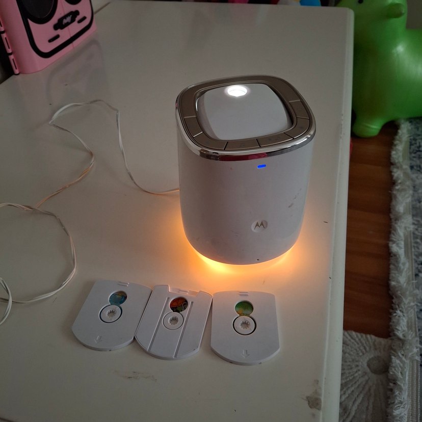 Üç çıkarılabilir sensör ve ortam ışığı özelliği bulunan beyaz Motorola bebek monitörü.