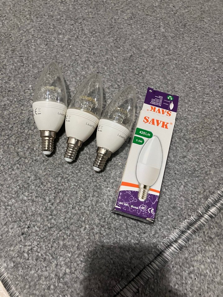 220 lm ışık veren beyaz mum ampul seti. Her ampul küçük vidalı tabana uyumludur ve SAVK, HAVS etiketlidir.
