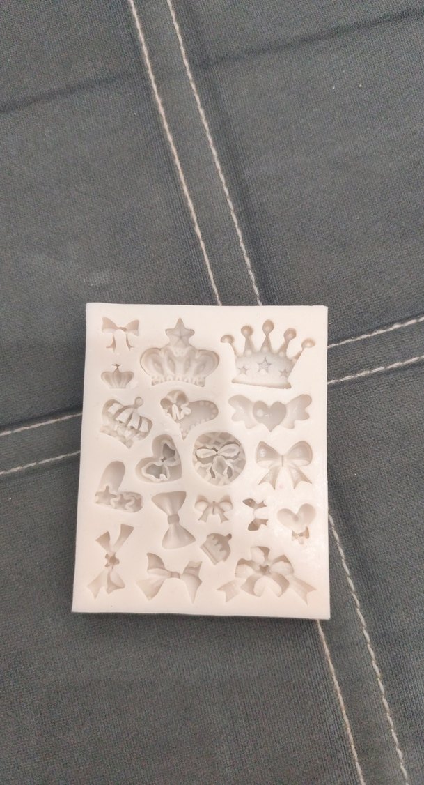 Taçlar, fiyonklar ve kalpler gibi çeşitli şekiller içeren beyaz mum süsleme kalıbı.