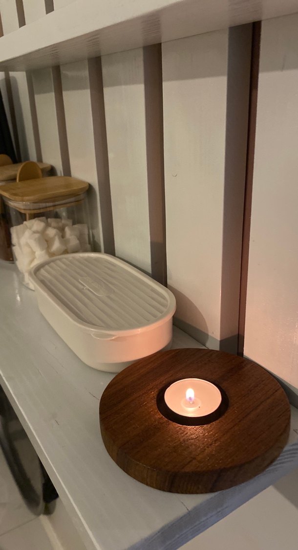 Ahşap bir mumluk üzerinde açık tonlarda beyaz bir mum bulunur. . ️ tik ağacından olduğu için bu fiyat cam ağacından fiyatı 100tldir