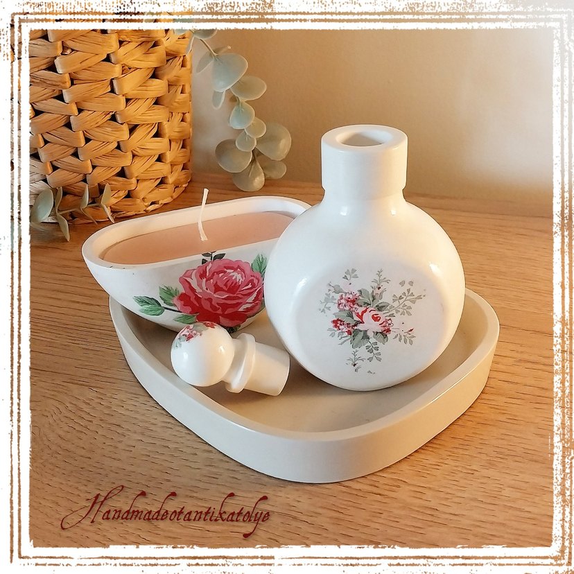 Pastel çiçek desenli beyaz seramik tozu el yapımı mum ve mumluk seti, mekana yumuşak ve zarif bir dokunuş katıyor.