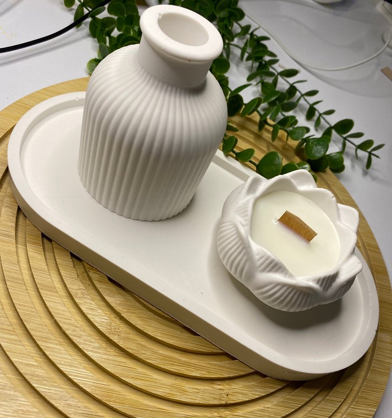Dikdörtgen tepsi üzerinde kabartmalı beyaz mumluk ve dekoratif kapta kokulu mum seti. Minimalist dekor için uygundur. ahşap fitil yanışıyla hayran bırakır