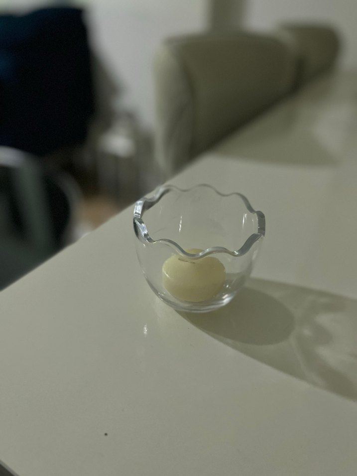 Dalgalı kenarlı şeffaf cam mumluk içinde beyaz mum yer alıyor. Mumluk, yumuşak ışığı tamamlayan sade ve net bir tasarıma sahip. ️