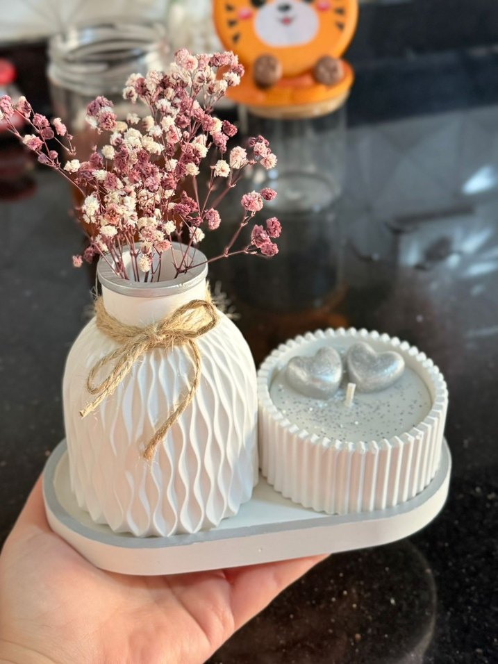 Beyaz dokulu vazoya yerleştirilmiş kurutulmuş çiçekler ve kalp detaylı beyaz mumdan oluşan dekoratif set. ️